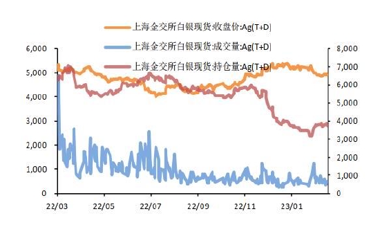 图7:内盘白银现货量价关系(元/千克,吨)