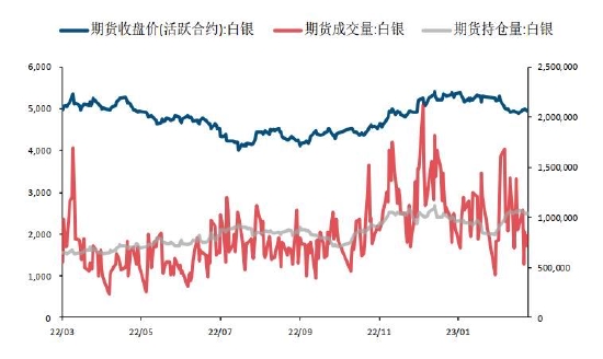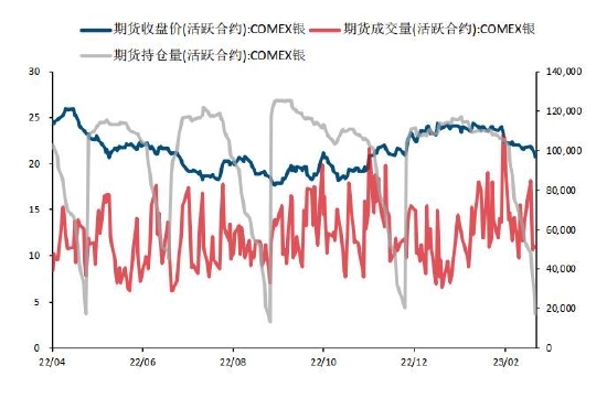 图4:外盘白银期货量价关系(美元/盎司,手)