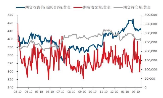 图1:内盘黄金期货量价关系(元/克,手)