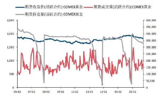 图2:外盘黄金期货量价关系(美元/盎司,手)