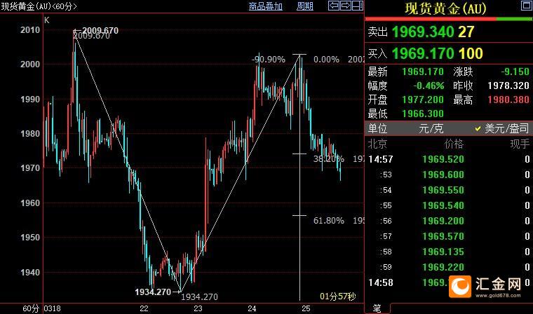 北京时间15:01,现货黄金下跌0.47%至1969.44美元/盎司;COMEX期金主力合约下跌0.64%至1971.1美元/盎司;美元指数上浮0.08%至103.110。