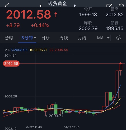香港时间13:53,现货黄金报2012.58美元/盎司。