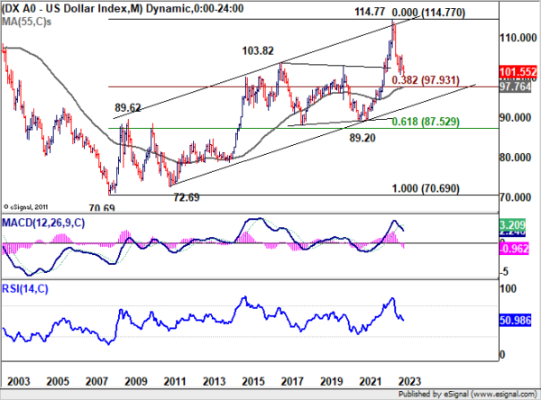下行方面,从美元指数月线图来看,如果美元指数跌破100.82,将使上述看涨前景无效,并导致从114.77开始的整体下行趋势恢复。在这种情况下,美元指数可能只能在55周期指数移动平均线(目前在97.76)处找到足够的反弹支撑,这接近70.69-114.77升势的38.2%斐波那契回撤位97.93。