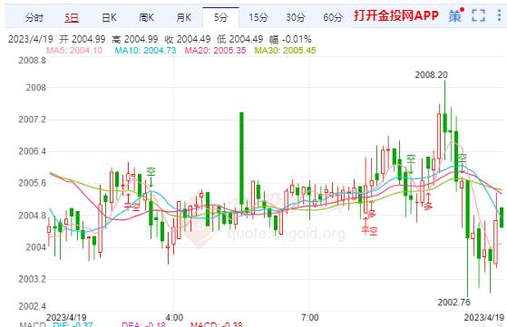 周三(4月19日)本交易日,现货黄金开于2007.27美元/盎司,最高上探至2008.20美元/盎司,最低触及2001.89美元/盎司,截至发稿暂报2005.11美元/盎司,涨幅0.01%。