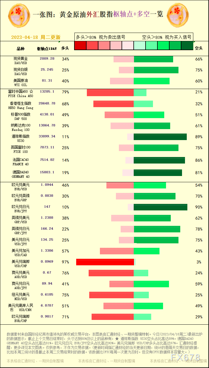 汇通财经APP讯——一张图:黄金原油外汇股指“枢纽点+多空占比”一览。今日(2023/04/18周二)最新出炉的数据显示,截止上个交易日结束时,头寸达到80%及以上的品种有:★ 道琼斯指数 US30空头占比高达89%。德国DAX40 GERMANY 40空头占比高达81%。欧元兑日元 EUR/JPY空头占比高达90%。美元兑瑞郎 USD/CHF多头占比高达97%。汇通财经提醒,更多详见本文图表。仅供参考,不作为交易依据。