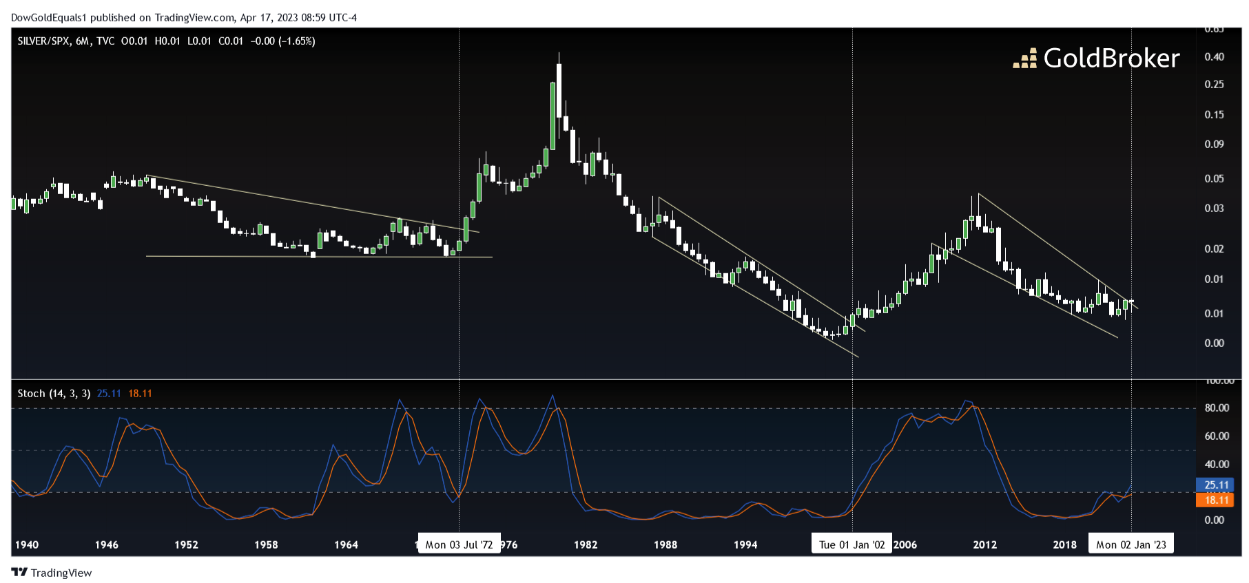 他继续补充,白银/标准普尔500指数比率显示出与黄金比率相似的情况,因为它也在过去100年中打破了第三次重大盘整。1970年至1980年间,之前的突破对应于白银从约1.30美元上升37倍至40美元。