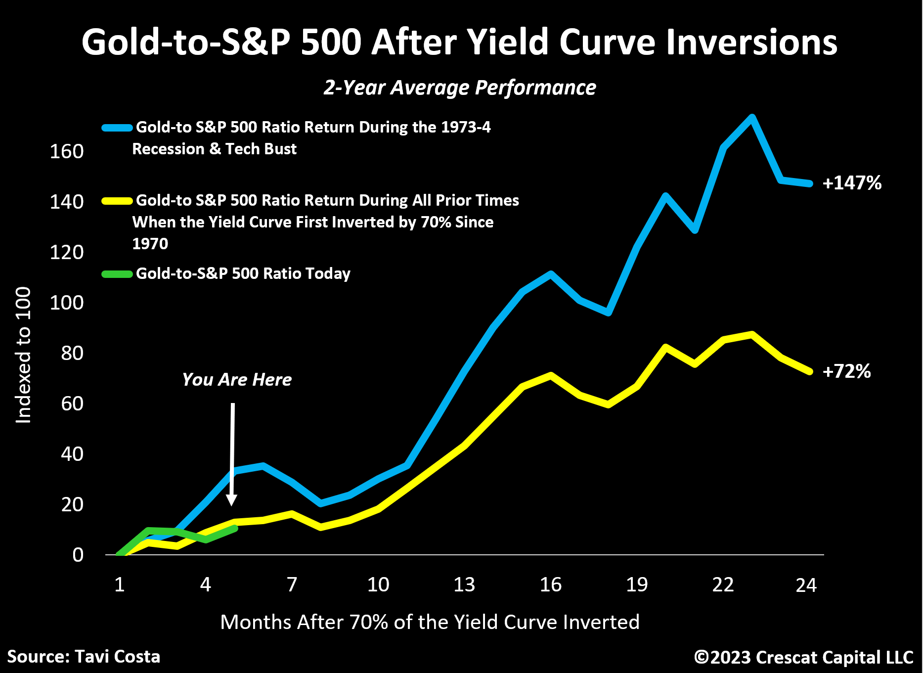 他解释:“我们的实证分析表明,今天贵金属相对于整体股市的表现仍处于初始阶段。准确地说,回溯到1970年,在美国国债曲线倒挂超过70%之后,这一比率在接下来的两年里往往会平均升值72%。”