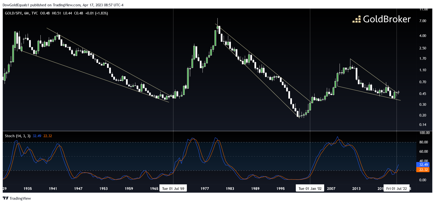 独立贵金属技术分析师Mike Roy表示,进一步提到,黄金/标准普尔500指数比率似乎正在打破过去100年来的第三次重大盘整。第一次整合从1935年到1972年持续大约37年,导致黄金从35美元上升25倍至1980年的最高点875美元。