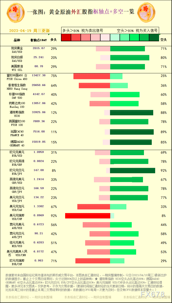 汇通财经APP讯——一张图:黄金原油外汇股指“枢纽点+多空占比”一览。今日(2023/04/19周三)最新出炉的数据显示,截止上个交易日结束时,头寸达到80%及以上的品种有:★ 道琼斯指数 US30空头占比高达88%。德国DAX40 GERMANY 40空头占比高达85%。欧元兑日元 EUR/JPY空头占比高达92%。美元兑瑞郎 USD/CHF多头占比高达92%。汇通财经提醒,更多详见本文图表。仅供参考,不作为交易依据。