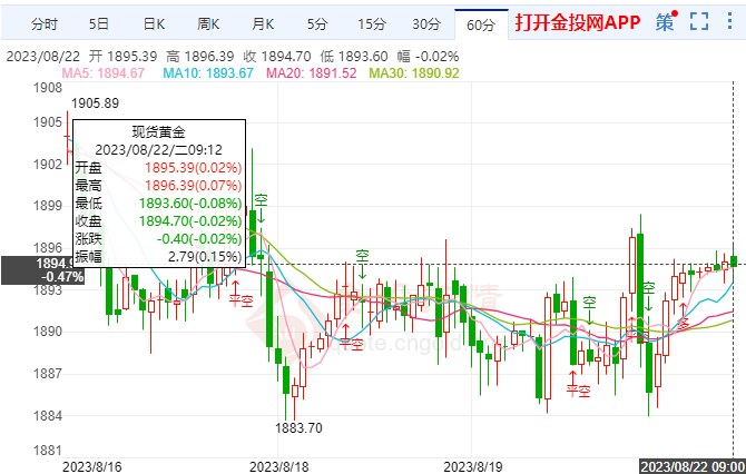 8月22日(周二),国际现货黄金盘内维持缓慢上行行情,黄金价格1890-1900美元/盎司区间内持续慢涨走势,日内金价小幅上行。