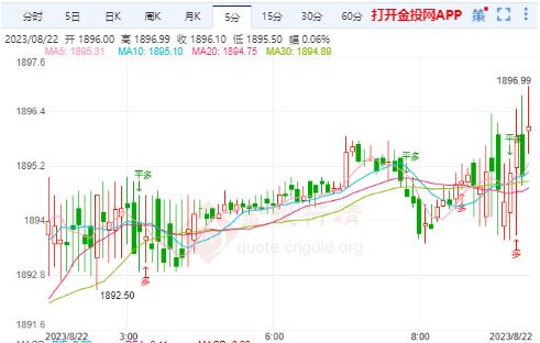 北京时间周二(8月22日),本交易日黄金期货触底反弹,暂报1896.09美元/盎司,涨幅0.09%,今日开盘报1894.39美元/盎司,最高触及1897.19美元/盎司,最低触及1893.50美元/盎司。