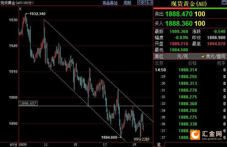 北京时间14:53,现货黄金下跌0.05%至1888.71美元/盎司;COMEX期金主力合约上浮0.05%至1917.5美元/盎司;美元指数徘徊在平盘103.434。