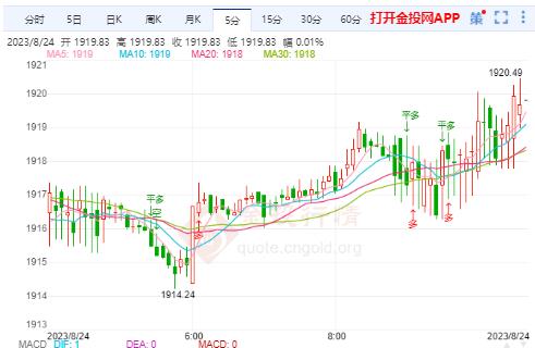 周四(8月24日)本交易日现货黄金日内守在1900美元上涨震荡,今日开盘报1913.38美元/盎司,最高触及1920.29美元/盎司,最低触及1913.38美元/盎司,截止发稿金价报1919.50美元/盎司,涨幅0.23%。