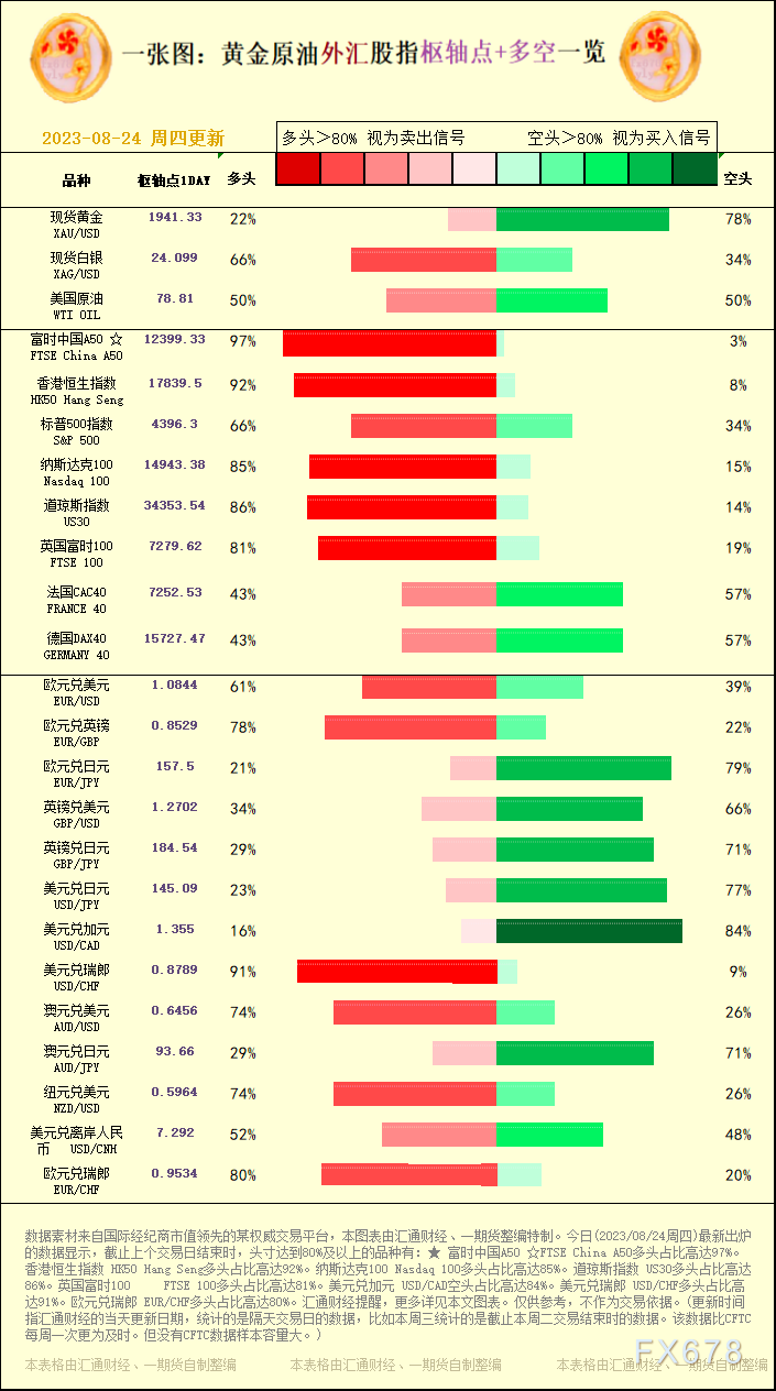 汇通财经APP讯——一张图:黄金原油外汇股指“枢纽点+多空占比”一览。今日(2023/08/24周四)最新出炉的数据显示,截止上个交易日结束时,头寸达到80%及以上的品种有:★ 富时中国A50 ☆FTSE China A50多头占比高达97%。香港恒生指数 HK50 Hang Seng多头占比高达92%。纳斯达克100 Nasdaq 100多头占比高达85%。道琼斯指数 US30多头占比高达86%。英国富时100FTSE 100多头占比高达81%。美元兑加元 USD/CAD空头占比高达84%。美元兑瑞郎 USD/CHF多头占比高达91%。欧元兑瑞郎 EUR/CHF多头占比高达80%。汇通财经提醒,更多详见本文图表。仅供参考,不作为交易依据。