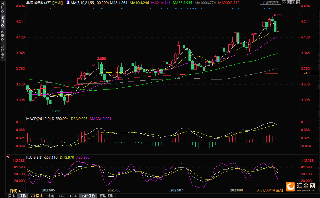 10年期国债收益率周三下跌13.6个基点,至4.192%,为近一周最低收盘价;本周早些时候曾触及4.366%,这是美国指标国债收益率自2007年11月以来未曾见到的高点。