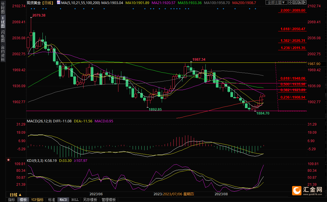 整体来看,欧美国家糟糕的PMI数据令美联储和欧洲央行的进一步加息预期降温,对明年更多降息的预期也有所升温,这在中长线吸引逢低买盘和避险买盘,而美元和美债收益率从高位回落,则在短线支撑金价,收复200日均线后,技术面短线看涨信号有所增强,金价短线有望延续反弹走势,关注1030关口和55日均线1933.35附近阻力。下方留意200日均线1908.75附近支撑。