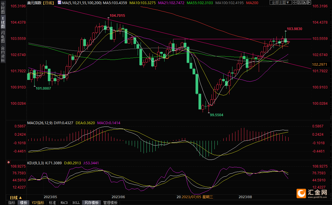 欧元区和英国的PMI数据后美元指数周三一度冲高至103.98,为6月8日以来新高,但在美国糟糕的PMI数据后,美元指数大幅走弱,收盘下跌0.22%,收报103.37。