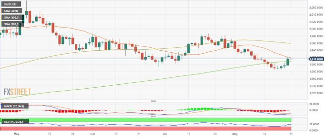 24K99讯 周四(8月24日)亚市盘中,现货黄金延续反弹走势,金价目前位于1918美元/盎司附近。从技术面来看,金价已经确认突破关键的200日移动均线,这预示金价后市仍有进一步攀升的空间。