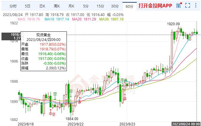本交易日,国际现货黄金盘内稳定慢行行情,黄金价格1920美元/盎司关口下方持续慢涨走势,日内早间黄金保持缓慢拉升趋势。