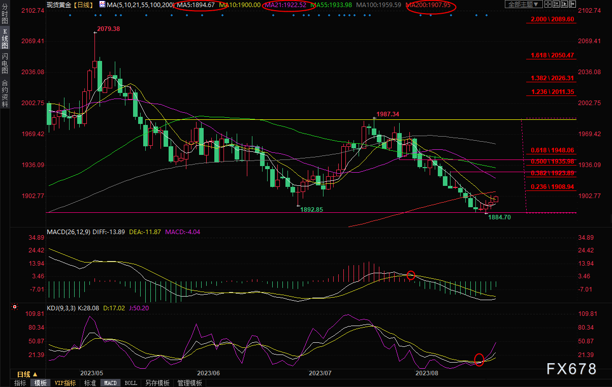 日线级别:震荡下跌后反弹;金价在1890下方录得类似“希望之星”的K线组合,KDJ低位金叉运行,暗示金价初步见底,在失守5日均线1894.65前,金价存在进一步反弹机会,关键阻力在200日均线1907.95附近,也可以参考1987-1884跌势的23.6%回撤位1908.94附近位置,若能顶破该阻力,则有望进一步上探1922.52附近阻力,21日均线和38.2%回撤位阻力都在该位置附近,如果进一步上破,则增加后市看涨信号。