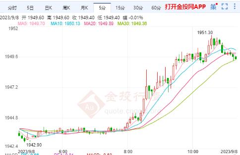 今日周五(9月8日),美黄金主力开盘价1943.8000美元/盎司,昨收价1944.0000美元/盎司。现货黄金日内开盘价1919.30元/盎司,昨收价1919.29元/盎司,截止北京时间11:16,美黄金主力报价1949.4000美元/盎司,涨幅0.28%;现货黄金报价1925.33美元/盎司,涨幅0.31%。