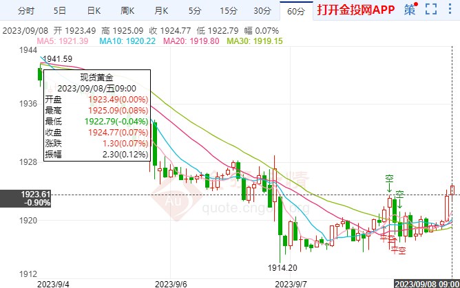 国际现货黄金本交易日盘内1920-1930美元/盎司区间内调整,黄金价格北京时间09:54暂报1925.36美元/盎司。