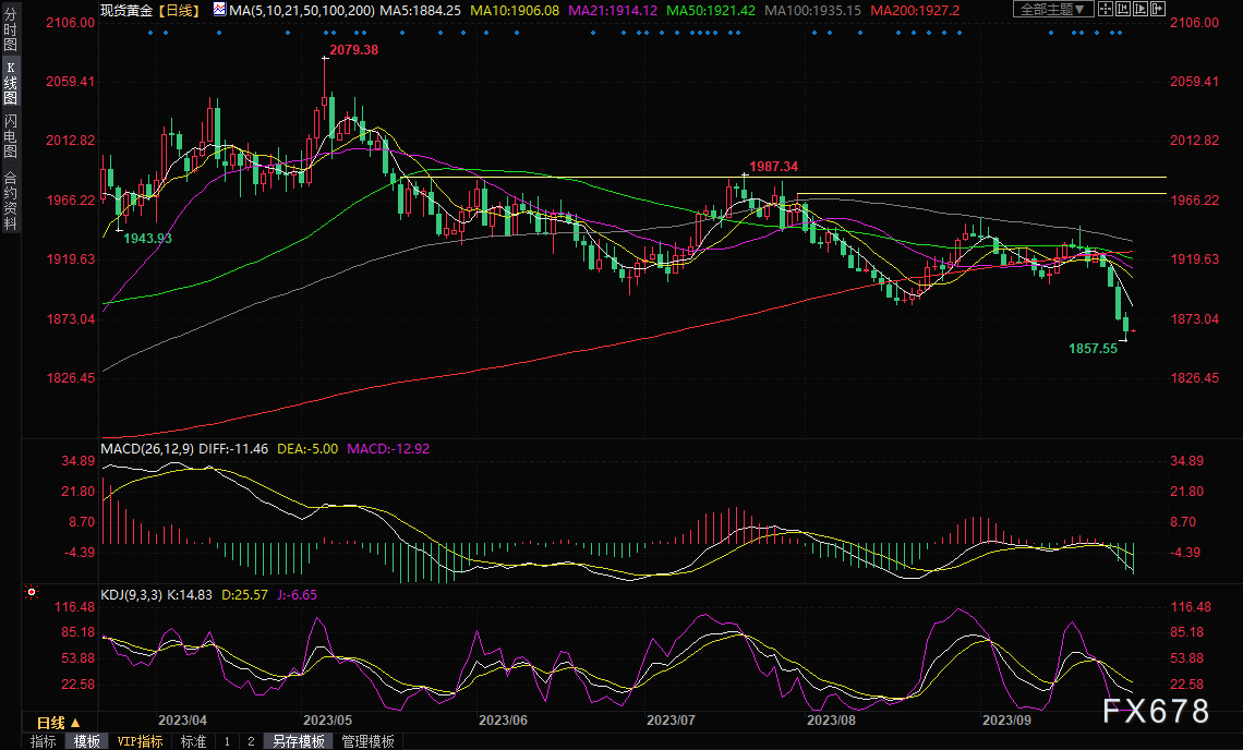 美市盘中,现货黄金一度下跌至1857.58美元/盎司低点,为自3月份以来的最低水平,较日高回落22美元/盎司。