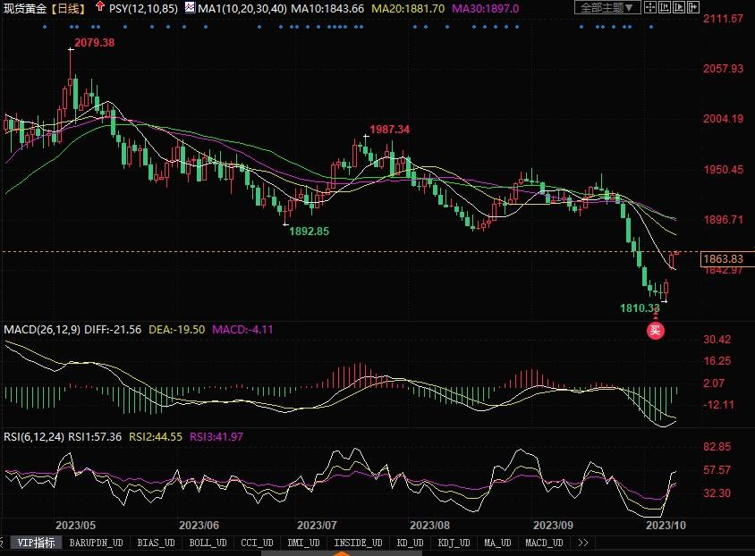 周一(10月9日),美联储官员发表鸽派言论,这打压美元走势,并令金价受到提振,当日升幅达1.54%,收盘于1860.85美元,盘中最高触及1863.46美元。