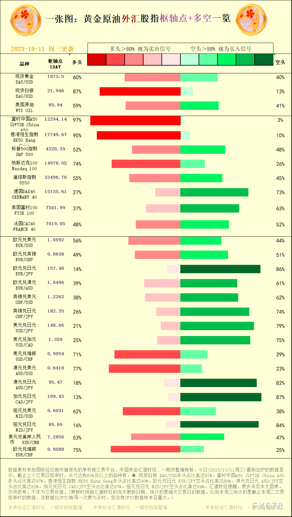 汇通财经APP讯——一张图:黄金原油外汇股指“枢纽点+多空占比”一览。今日(2023/10/11周三)最新出炉的数据显示,截止上个交易日结束时,头寸达到80%及以上的品种有:★ 现货白银 XAG/USD多头占比高达87%。富时中国A50 ☆FTSE China A50多头占比高达97%。香港恒生指数 HK50 Hang Seng多头占比高达90%。欧元兑日元 EUR/JPY空头占比高达86%。澳元兑日元 AUD/JPY空头占比高达82%。加元兑日元 CAD/JPY空头占比高达87%。纽元兑日元 NZD/JPY空头占比高达84%。汇通财经提醒,更多详见本文图表。仅供参考,不作为交易依据。