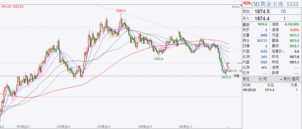截止10月10日收盘,COMEX黄金12月合约亚市收盘于1873.8美元/盎司,涨幅0.51%,成交152865手,持仓363771手;COMEX白银12月合约亚市收盘于22.005美元/盎司,涨幅0.37%,成交42606手,持仓105220手。