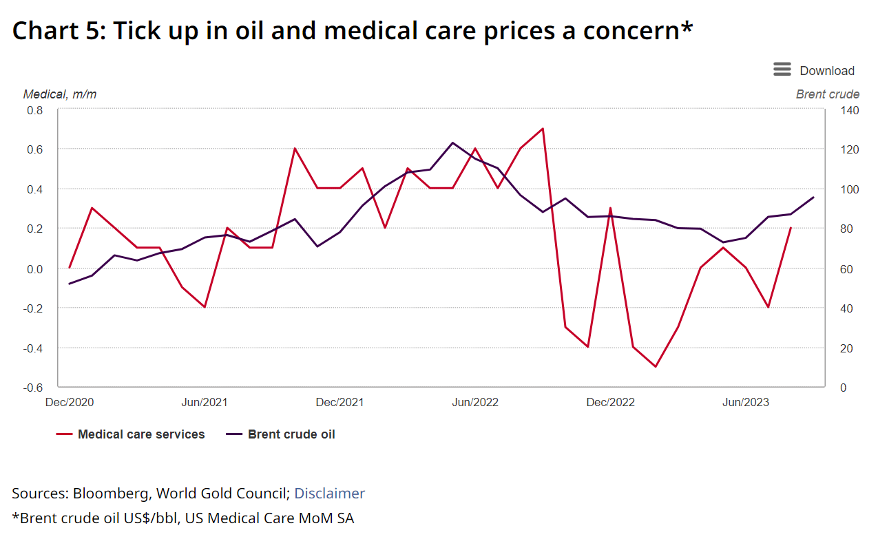 经济韧性和收益率上升的结合可能会给黄金带来持续的动荡。然而,该报告认为,黄金更有可能经历波动而不是实质性疲软,因为许多因素仍然存在,包括股市风险回报不佳、未来 6-12 个月衰退风险上升、通胀波动和央行购买。