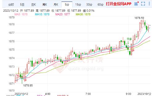 周四(10月12日)本交易日现货黄金日内维持震荡小幅上涨,今日开盘报1873.60美元/盎司,最高触及1876.89美元/盎司,最低触及1873.52美元/盎司,截止发稿金价报1876.70美元/盎司,涨幅0.14%。