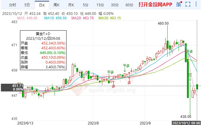 本周四(10月12日),黄金t+d早间稳定慢涨,金价450元/克一线附近慢涨,日内黄金开启小幅反弹。