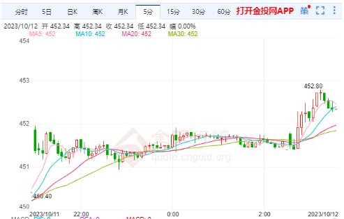 今日周四(10月12日),北京时间09:58,沪金主力开盘价451.92元/克,昨收价450.40元/克;黄金TD日内开盘价452.34元/克,昨收价449.85元/。沪金主力报价452.30元/克,涨幅0.43%;黄金td报价451.20元/克,涨幅0.51%。