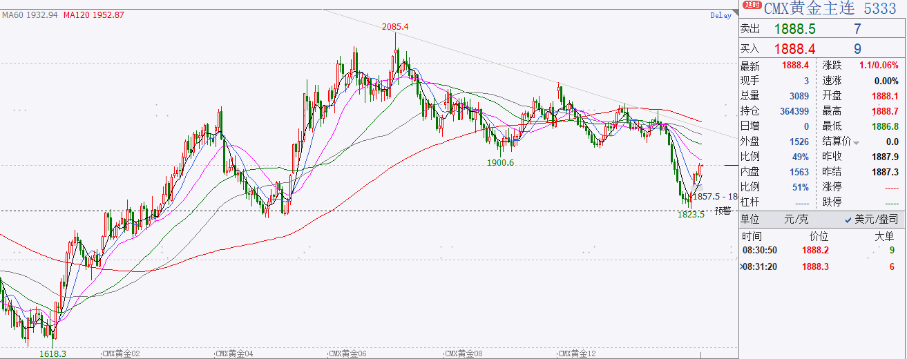 截止10月11日收盘,COMEX黄金12月合约亚市收盘于1887.9美元/盎司,涨幅0.67%,成交162914手,持仓364399手;COMEX白银12月合约亚市收盘于22.2美元/盎司,涨幅1.13%,成交43371手,持仓104646手。