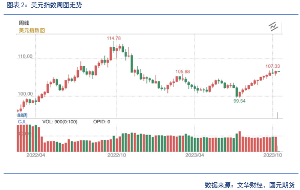 上周前半段美联储言论偏鸽,美元一度走弱,后半段多项数据发布,美国9月PPI增长大超预期,美国9月CPI加快增长,美国消费者信心大幅回落,通胀预期激增,美元止跌反升至一周高位。巴以冲突加剧,避险情绪激增。本周需关注美国9月零售销售环比、美国9月制造业产出环比、美国9月新屋开工以及美国10月14日当周首次申请失业救济人数等。地缘政治风险加剧,避险情绪助推贵金属大涨。