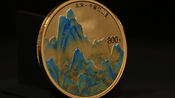 50克圆形金币直径40毫米,面额800元,最大发行量1000枚。背面图案选取了《千里江山图》中最高峰及其周边场景,是画作中标志性的场景之一,也是全卷的高潮部分。背面工艺采用喷砂底面,主图案采用浮雕结合彩色喷绘工艺,以一种特殊的浮雕工艺做出山峦叠翠的视觉效果,底面透出金本色,使金本色与千里江山图的青绿山水相呼应,币面清爽干净,营造山水空灵幽静之美。