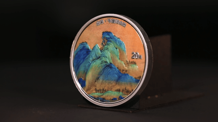 3枚圆形银币背面图案均采用了《千里江山图》中部分标志性场景,运用浮雕结合光变鳞彩和彩色喷绘工艺,再现了千里江山图中山水等景色的远近层次关系。在用色上,现代工艺也能尽最大可能还原王希孟施色手法的变化,虽然以青绿为主色调,但色彩或浑厚,或轻盈,使画面层次分明,色如宝石,光彩夺目。