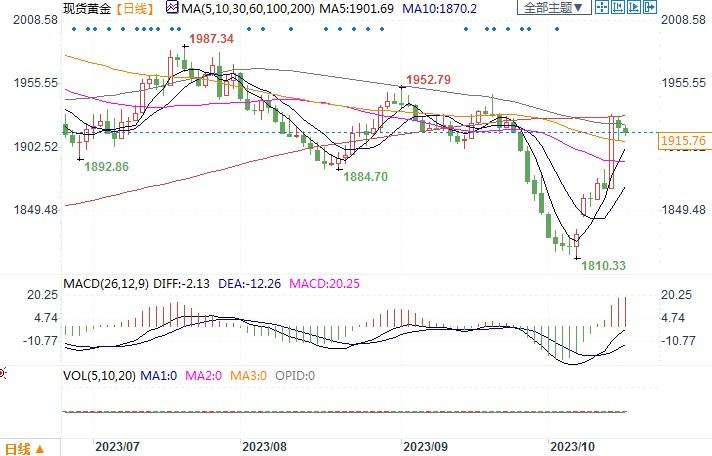 现货黄金日线图北京时间10月17日13:39 现货黄金 报 1915.52 美元/盎司