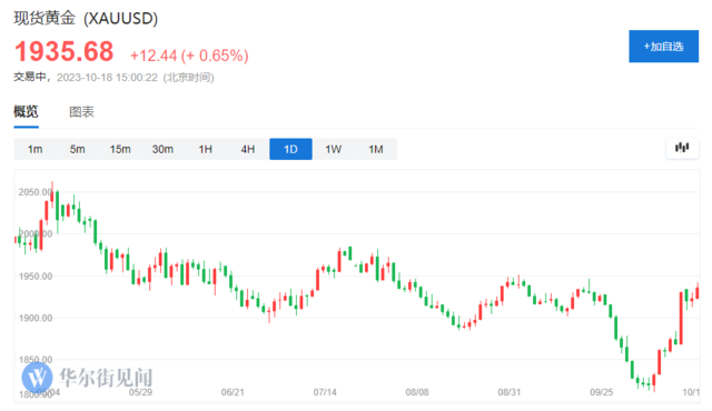周三截至发稿,现货黄金上涨0.65%,报每盎司1935.68美元。