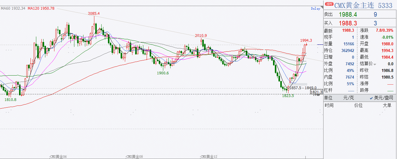 截止10月19日收盘,COMEX黄金12月合约亚市收盘于1986.8美元/盎司,涨幅0.94%,成交253690手,持仓362942手;COMEX白银12月合约亚市收盘于23.195美元/盎司,涨幅0.42%,成交57408手,持仓98023手。