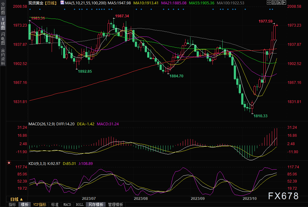现货黄金周四收涨1.37%,收报1974.15美元/盎司,返回7月中旬以来高点位置。