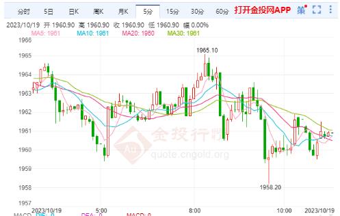 今日周四(10月19日),美黄金主力开盘价1960.1000美元/盎司,昨收价1960.3000美元/盎司。现货黄金日内开盘价1947.39元/盎司,昨收价1946.99美元/盎司,截止北京时间10:55,美黄金主力报价1960.8000美元/盎司,涨幅0.04%;现货黄金报价1948.85美元/盎司,涨幅0.10%。