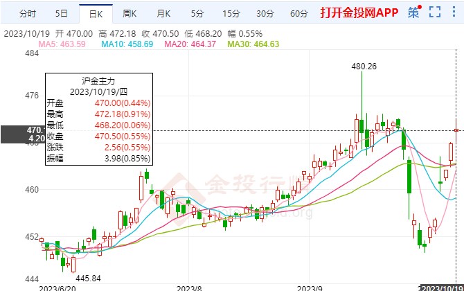 10月19日(周四),黄金期货盘内企稳缓慢上行,沪金北京时间10:34暂报470.14元/克,涨幅0.90%。