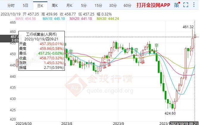 今日周四(10月19日),纸黄金盘内458元/克一线附近缓涨,日内金价460元/克关口下方慢幅拉高。北京时间10:30,黄金暂报458.01元/克。