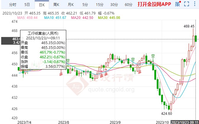 10月23日(周一),纸黄金盘内行情小跌势,日内黄金价格保持下落行情。北京时间10:47,纸黄金暂报463.60元/克。