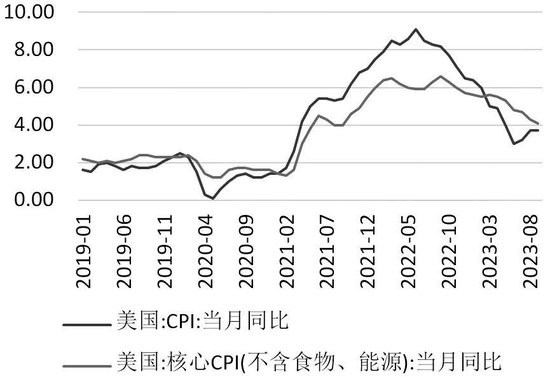 美国通胀依旧居高不下,存在再次上行的风险。美国通胀自去年6月从高位迅速回落,但今年6月以来又出现回升趋势,核心通胀指数降幅也趋缓。9月美国CPI同比增长3.7%,与8月持平,但较6月3%的阶段性低点回升0.7个百分点,去除食品、能源影响的核心CPI为4.1%,较8月的4.3%回落0.2个百分点。9月PCE数据未公布,8月PCE数据为3.5%,较前月上升0.2个百分点,核心PCE为3.9%,较前月下降0.3个百分点。前期通胀数据的大幅回落得益于疫情后全球供应链压力缓解和能源价格回落,但这些有利因素的影响正有所减弱,RJ/CRB商品价格指数10月13日为283.97,自6月以来小幅回升,原油价格在国庆假期回落后受中东地区冲突升级而涨势强劲。而由于工资增速较高,服务业相关分项又有进一步上行的风险。此外,虽然通胀预期或再次升温,但目前实际利率主要还是受当前美国良好的经济前景推动,下行的可能性较小。总体来说,由于通胀当前存在再次上行的风险,美联储货币政策将更加谨慎考虑转向宽松的时机。
