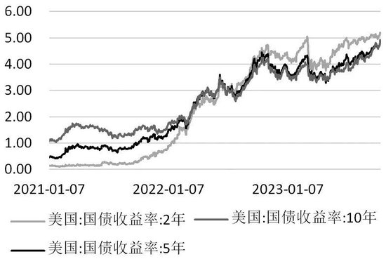 美国国债收益率一路上涨,不断创新高。综合来看,由于美国经济基本面韧性较强、美国政府借贷需求较高导致的美债供需失衡、债务上限问题导致的美债评级下调等,美国国债收益率总体呈现一路上升趋势。截至10月18日,美国2年期、5年期和10年期国债收益率分别为5.19%、4.92%和4.83%,美国国债10年期与2年期利差为0.28%。9月底鲍威尔在利率决议中宣布暂停加息,但同时表示利率将在更长时间内维持高位,叠加美国较强的经济基本面数据,使得利率维持高位的预期较强。同时,美国劳动力市场的需求旺盛使得美国家庭部门购买力强劲,而政策扶持下的美国产业回流也推动企业部门的投资,美债实际利率预计也将维持较高水平。