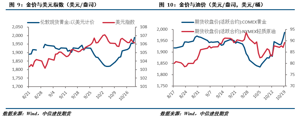 本周金银均表现较为强势,特别是黄金连续上涨,并创近5个月以来新高,与此同时,十年期美债收益率逼近5%,黄金与美债收益率的负相关关系未能体现,表明避险资金正持续涌入贵金属板块。