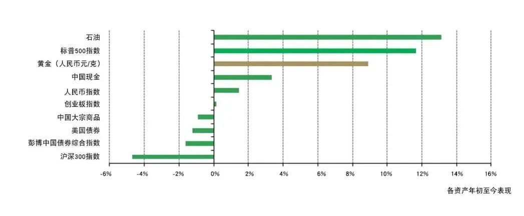 *图中数据基于上海SHAUPM午盘金价、标普500指数、WTI原油、彭博美国国债综合指数、中证中国货币市场基金指数、万得中国商品指数、彭博中国债券综合指数、中国外汇交易中心(CFETS)人民币指数、沪深300股指和创业板股指。时间截至2023年8月31日,所有计算均以人民币为单位。